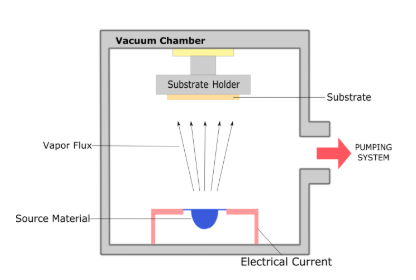 Thermal evaporation is one of the simplest of Physical Vapor Deposition (PVD) used to deposit material. The materials (metal, organic materials...) are placed in a resistive heat source in vacuum environment to evaporate directly to the substrate, where they condense back to a solid state form a thin film. Thermal evaporation offers faster evaporation rates than sputtering. However, it is limited to size of boat or crucible to contain the material and difficult to control of the evaporation rate.